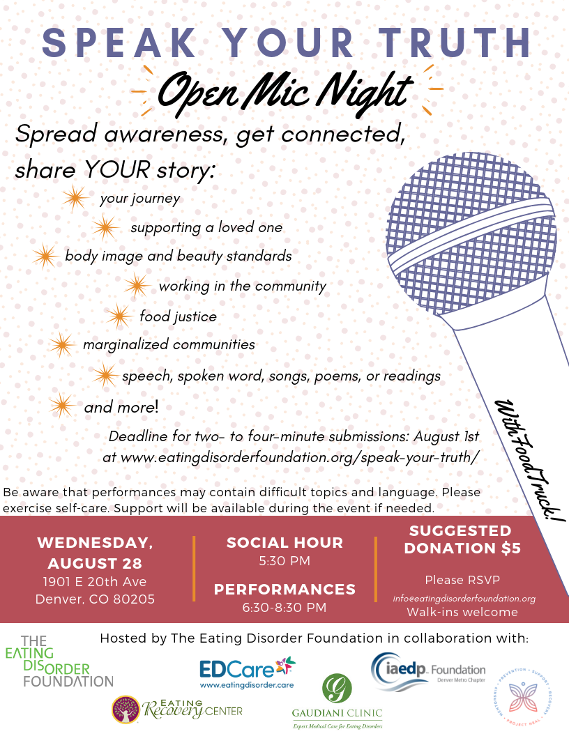 We are accepting submissions from all communities, regardless of race, gender, sexual orientation, religion, socioeconomic status, and/or disability and will strive to represent a diverse population to show eating disorders can affect anyone. Individuals with struggles, family members, clinicians and friends. All are welcome to the mic.