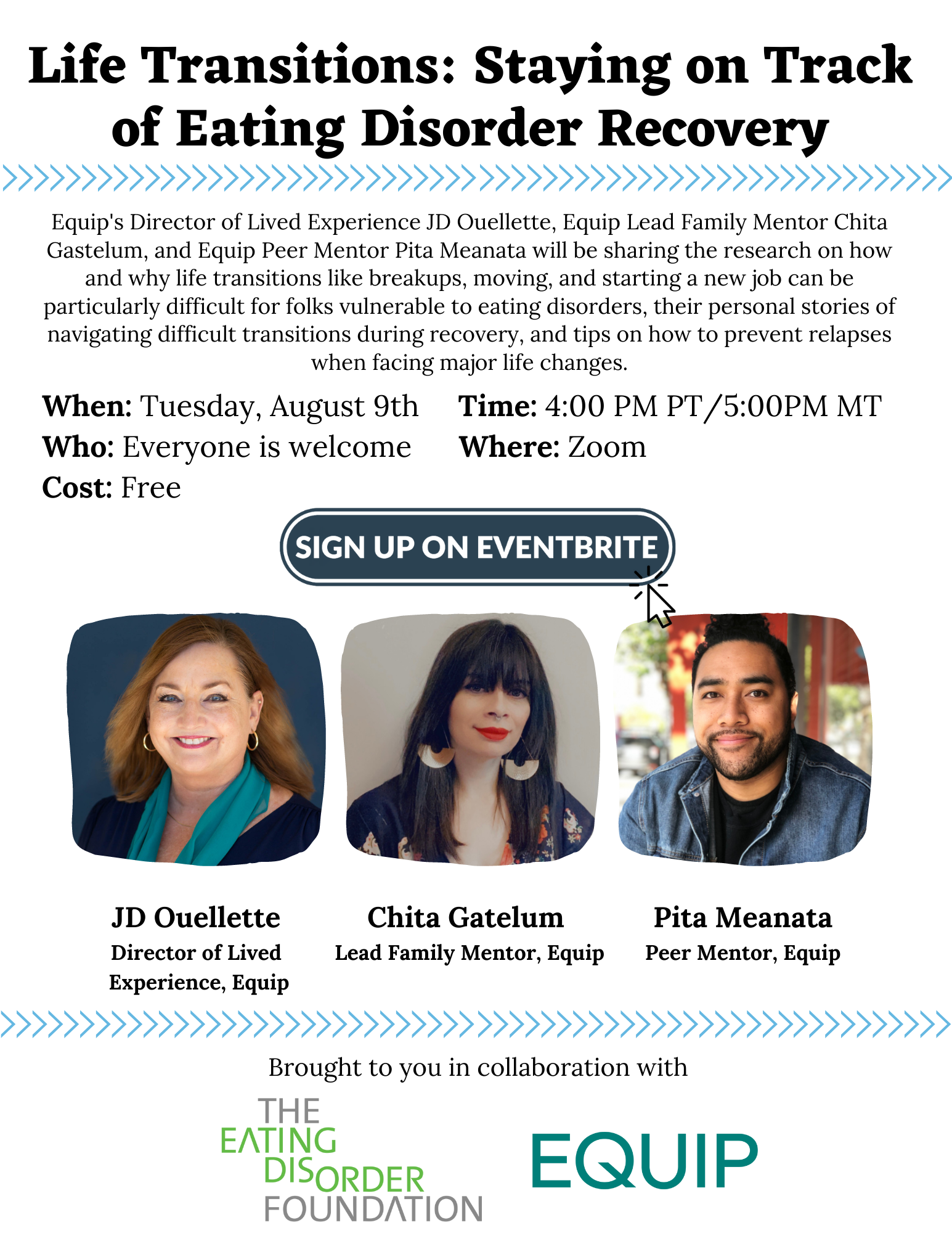 Join Equip’s Director of Lived Experience JD Ouellette, Equip Lead Family Mentor Chita Gastelum, and Equip Peer Mentor Pita Meanata will be sharing the research on how and why life transitions like breakups, moving, and starting a new job can be particularly difficult for folks vulnerable to eating disorders, their personal stories of navigating difficult transitions during recovery, and tips on how to prevent relapses when facing major life changes.